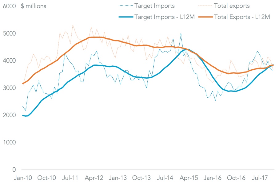While the Commerce Department has already acknowledged the risk of such – hence the country-specific options as well as broader tariffs – there’s no reason why retaliation would be limited to equivalent products. Exports of all steel and aluminum products to all countries were worth $46 billion in 2017. That’s the same amount as the imports of specific products being protected by the s232 case, and would suggest a targeted approach would make more sense.