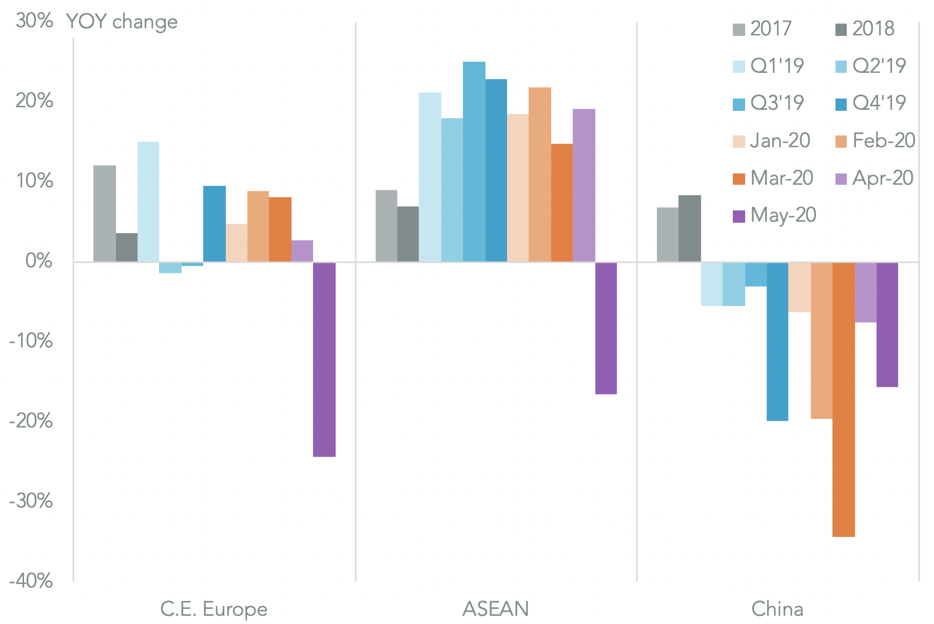 Panjiva’s U.S. seaborne data shows that shipments from CEE countries ( OECD definition) have increased by 0.6% in the six months to May 31 while those from south-east Asia ( ASEAN) have increased by 12.6% and shipments from China dropped by 17.5%. In 2019 compared to 2017 – a proxy for the U.S.-China trade war – shipments from CEE have increased by 8.7% while those from SEA have surged 30.3% and imports from China dropped 1.3%.