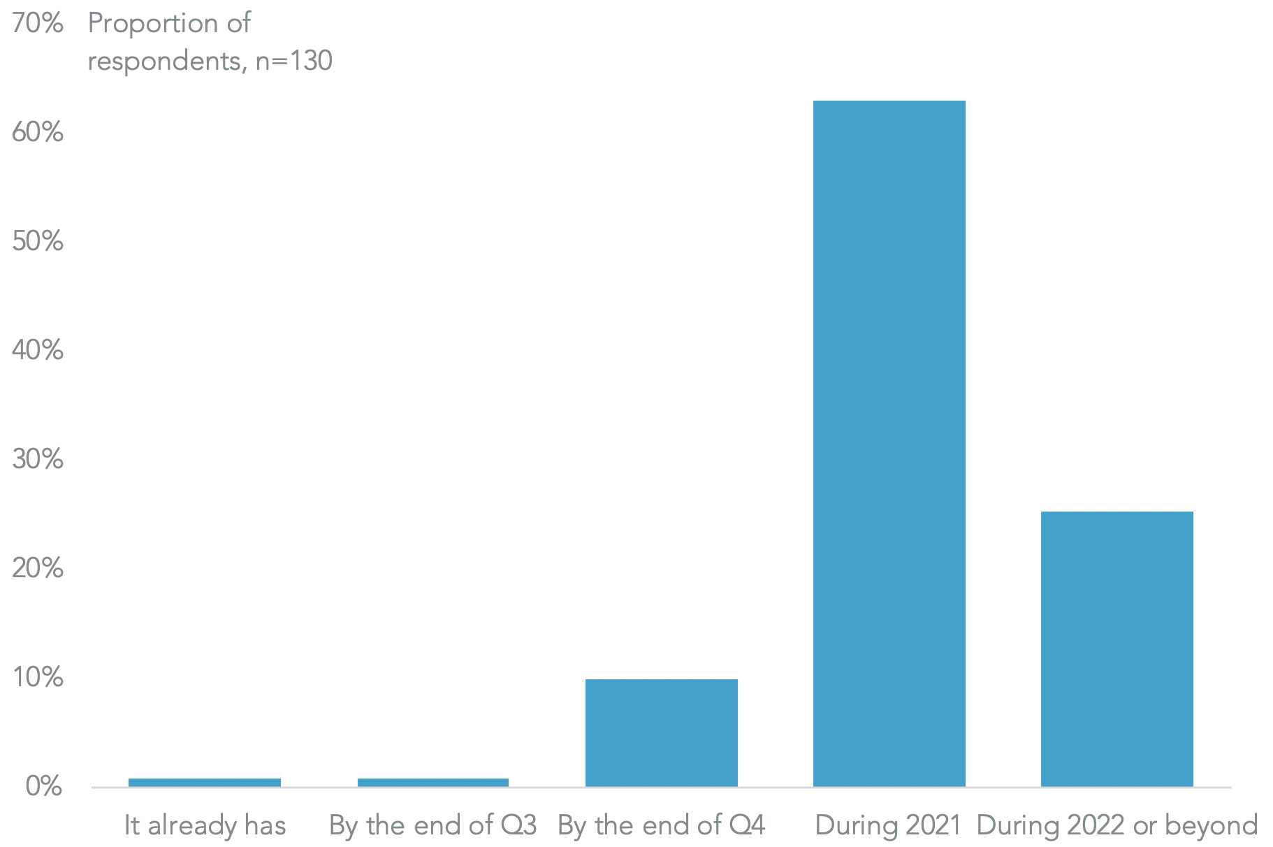 We asked the participants of the webinar, drawn mostly from the credit financial community and credit divisions of non-financial corporates, “How long will it take for supply chain activity to return to pre-pandemic levels?” By far the majority don’t see a return to normality in 2020 with 63.1% of respondents expecting it during 2021 and a further 25.4% not expecting it until 2022. That aligns with S&P Global Ratings‘ macroeconomic outlook for global GDP.