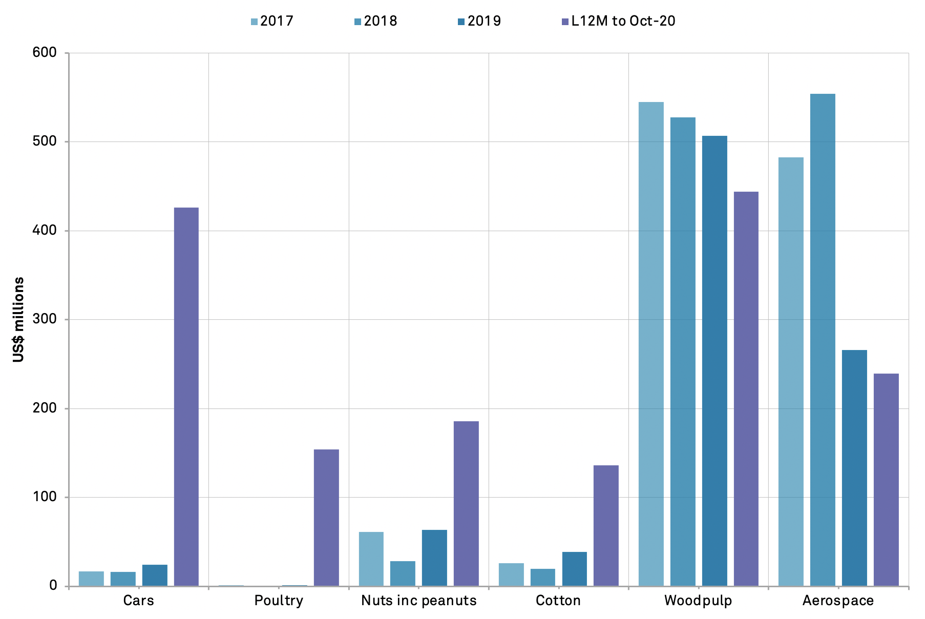 The rapid expansion of automotive exports has also been core to the recovery of exports from Georgia to China with $420 million of shipments in the three months to Oct. 31 compared to just $4 million a year earlier. The other main contributors have been a surge in exports of poultry, including shipments by Intervision Foods, to reach $67 million in the three months to Oct. 31 versus near zero both a year earlier and in 2017.