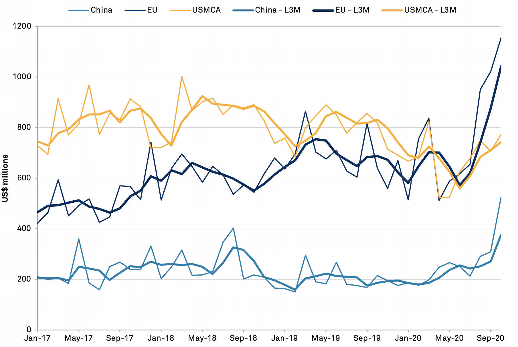 While that would suggest the importance of a need to rebuild relations with the EU, which have been damaged by spats over aerospace and metals, there’s nonetheless been a strong recovery in exports to the EU. Shipments to the EU rose by 51.6% year over year in the past three months due to a resumption of exports of passenger vehicles by Daimler’s Mercedes Benz, Panjiva’s data shows.