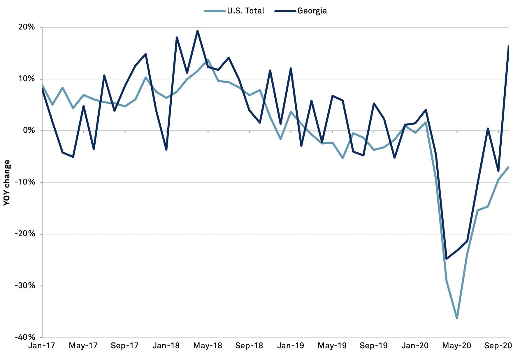Georgia’s also benefited from the phase 1 trade deal negotiated by the Trump administration. Total exports to China from the state rose by 100.9% year over year in the three months to Oct. 31. That resulted in a 17.8% increase in the past 12 months compared to 2016 while the national average included a 0.7% reduction.