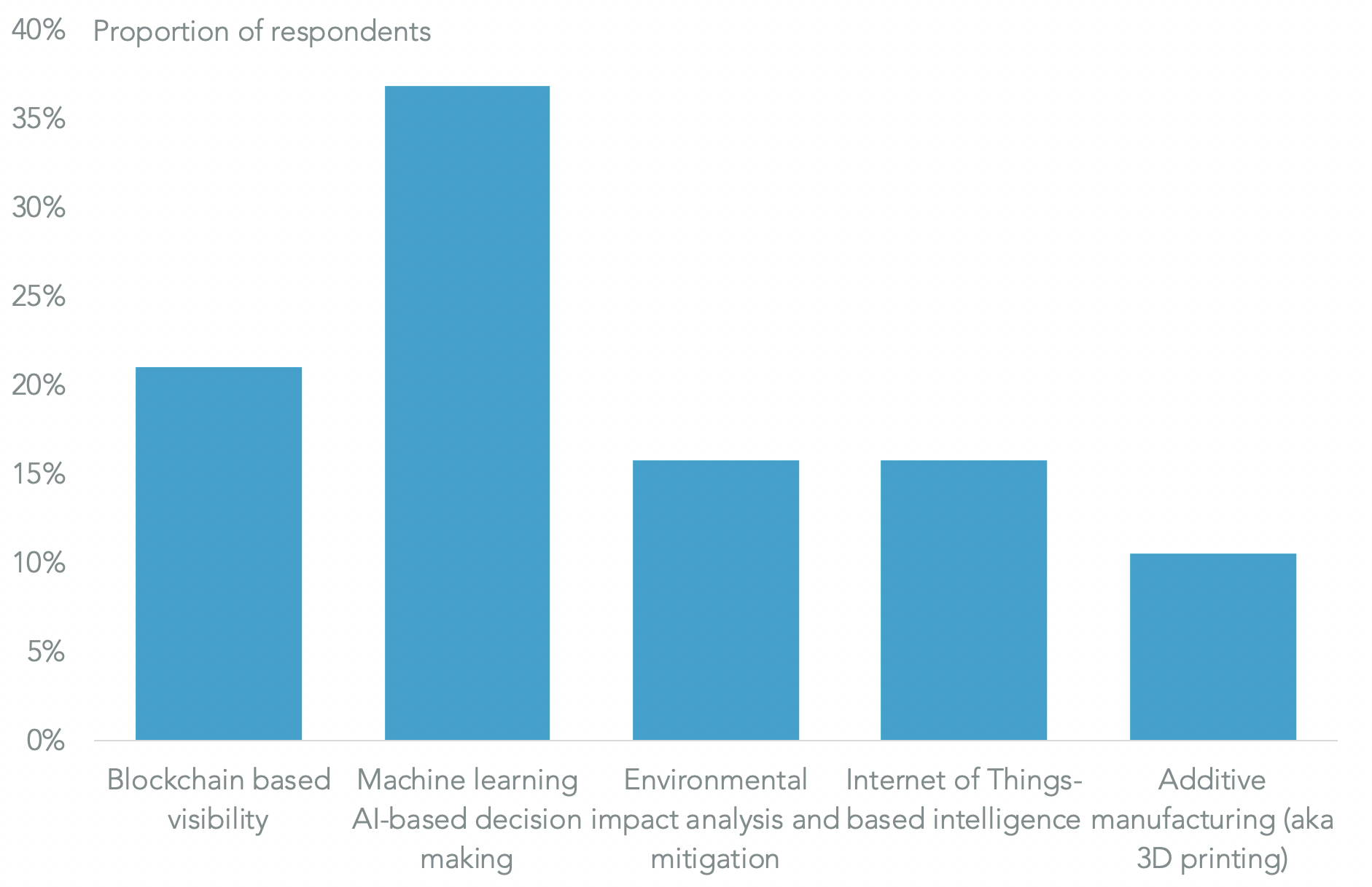 Global supply chain decision makers are faced by a panoply of technological choices for enhancing their business operations – some have more value than others. Audience opinion about the five technologies were evenly balanced though machine learning / AI-based decision making led the way with 37% of respondents rating it most highly. Blockchain was second with 21% while additive manufacturing came in last (11%).