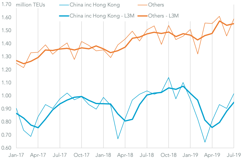 In the short-term there appears to have been more of a shift in U.S. imports to other countries rather than to the U.S. Panjiva data for U.S. seaborne imports shows that shipments of containerized freight from China fell 5.5% year over year in the three months to Jul. 31, while those from the rest of the world climbed 5.4% with the result that total imports were unchanged.