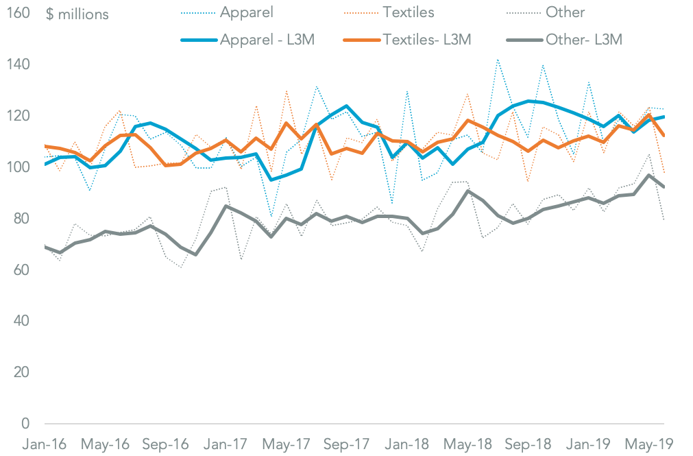 That may allow growth from products outside the traditional groups of apparel and textiles which accounted for $2.80 billion of U.S. imports in the 12 months to Jun. 30, or 72.8% of the total.