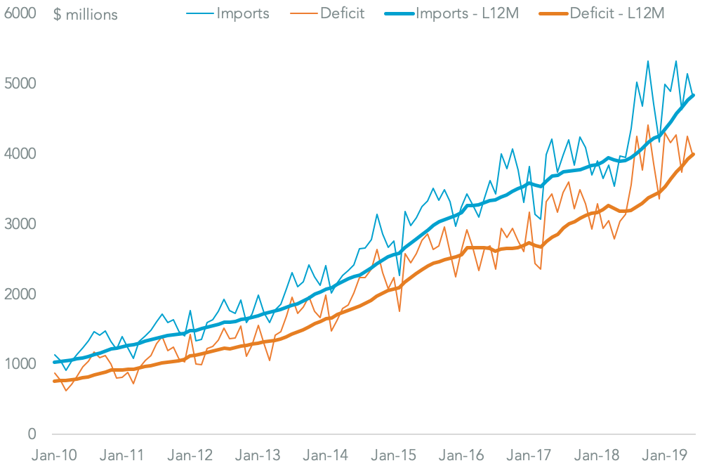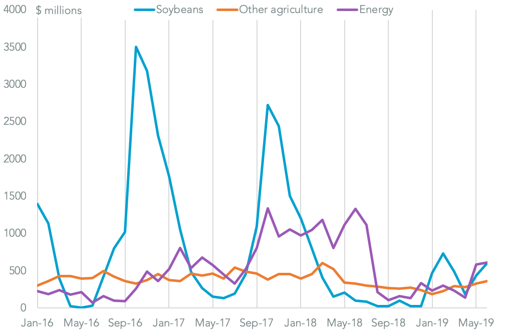 The latter is illustrated by U.S. exports of agricultural and energy goods. In June 2019 exports of soybeans – a “goodwill product” designed to encourage a rapprochement with the Trump administration – to China from the U.S. jumped 496% year over year while imports of other agricultural products rose 10.5%. In the energy sector meanwhile imports fell 59.1%, likely due to China’s increasing imports from Iran.