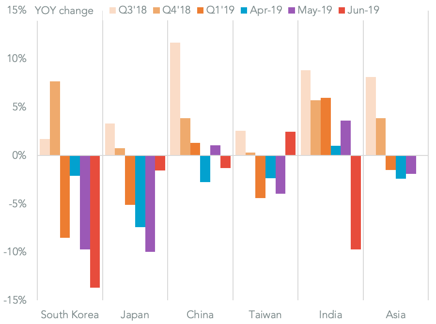 Such a move has come despite the slowdown in exports in the region, with 12 of the 14 Asia-Pacific countries that have reported export figures for June having seen a year-over-year drop in exports, Panjiva analysis of S&P Global Market Intelligence figures shows.