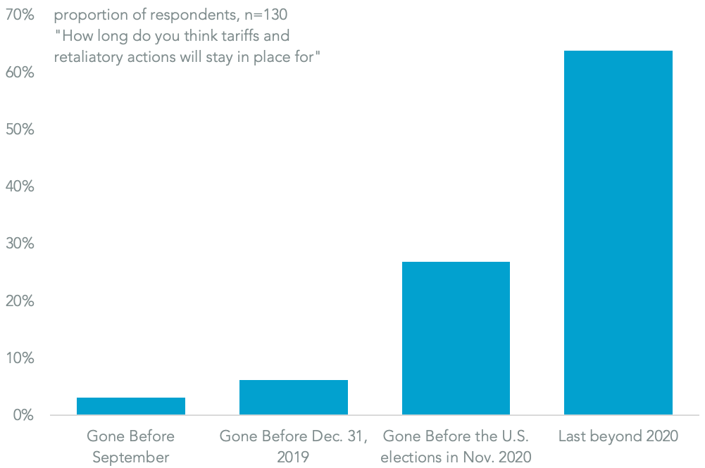 We asked the webinar’s audience how long they expect the current situation of trade conflict between the U.S. and China will last. The vast majority of respondents – 63.8% of 130 survey respondents – expect it to last beyond 2020.