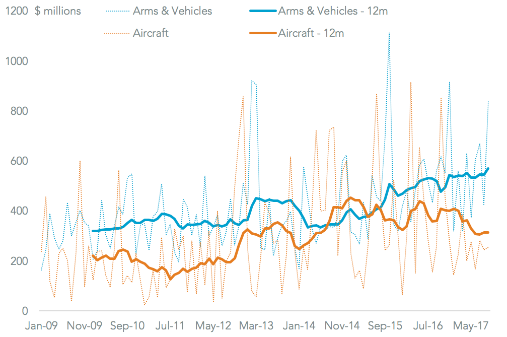 The 24.5% rise in orders year-to-date should help turn around total exports which fell 9.8% on a year earlier in the first nine months of 2017. That’s mostly been due to the exports of military jets – Panjiva data shows these fell 32.6% over the same period – whereas shipments of weapons systems and vehicles actually increased by 6.8%. On a trailing 12 month basis exports of weapons reached their highest since at least 2009. It should be noted though that most of the major orders signed are delivered over years rather than months.