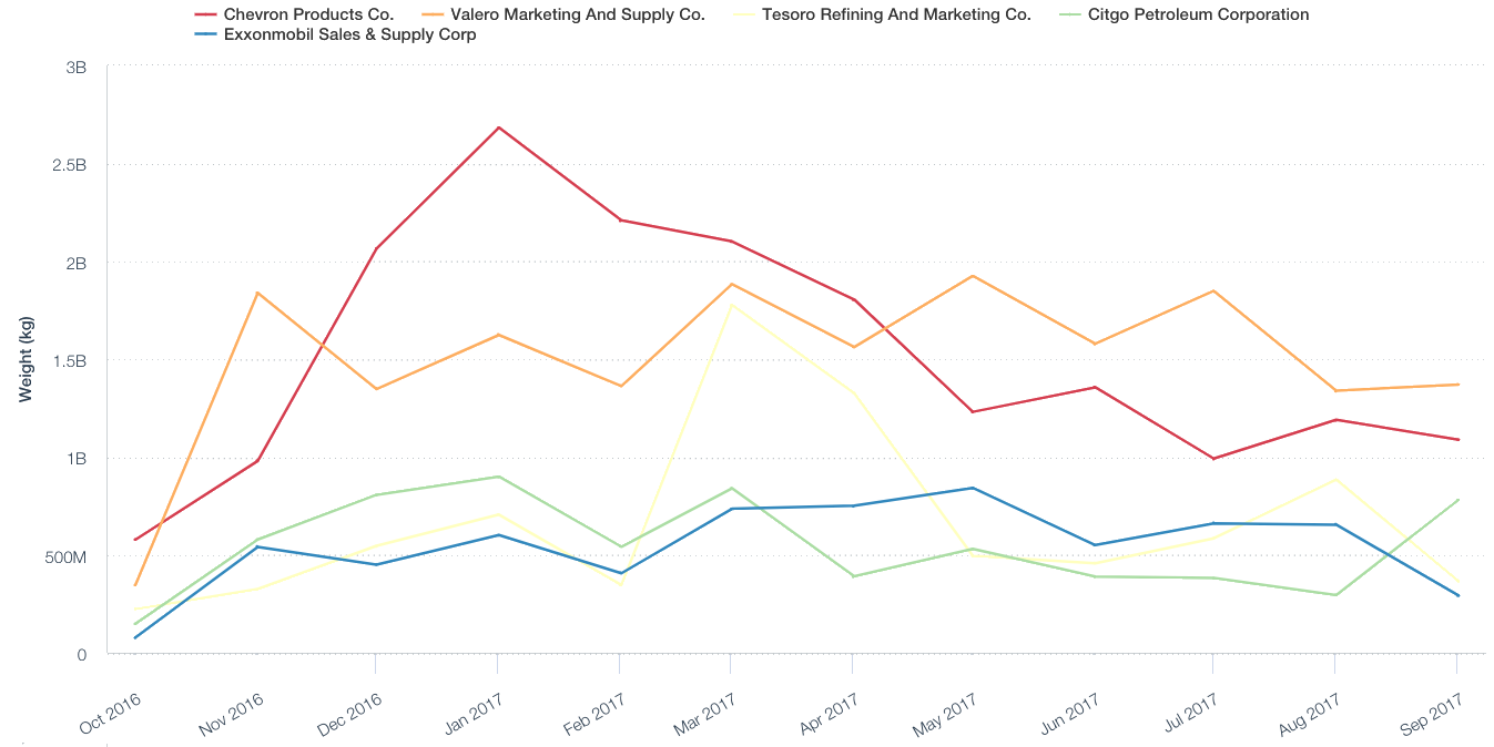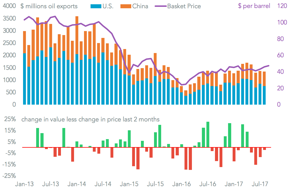 The country broadly has been highly reliant on oil export earnings, and can ill-afford disruptions to PdVSA’s dealings with other countries. Panjiva data shows exports to the U.S. increased 0.3% on a year earlier, while those to China climbed 8.2% in August vs. a year earlier. However, the total growth of 3.6% (to reach $1.34 billion) came against the backdrop of a 13.6% jump in oil prices, suggesting a slump in production.