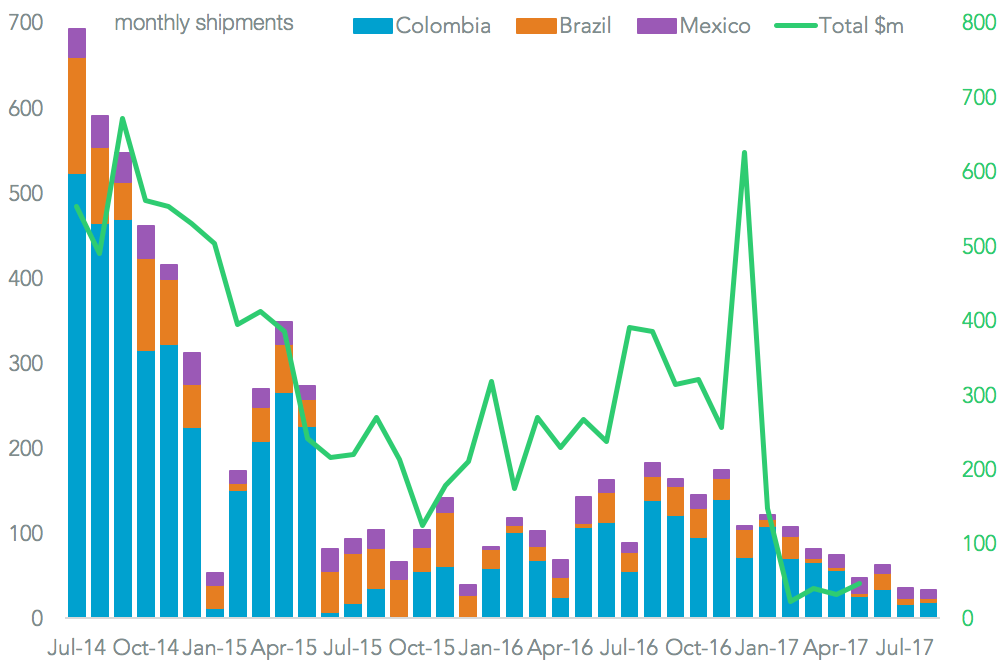 The bigger issue, of course, is whether the Venezuelan government can continue to support food imports, which are largely under the control of the military. Panjiva data shows imports of meat, cereals and sugar from Brazil, Colombia and Mexico reached a new low in August in shipment terms after falling 35.0% in the quarter to August 31 on the prior three months.