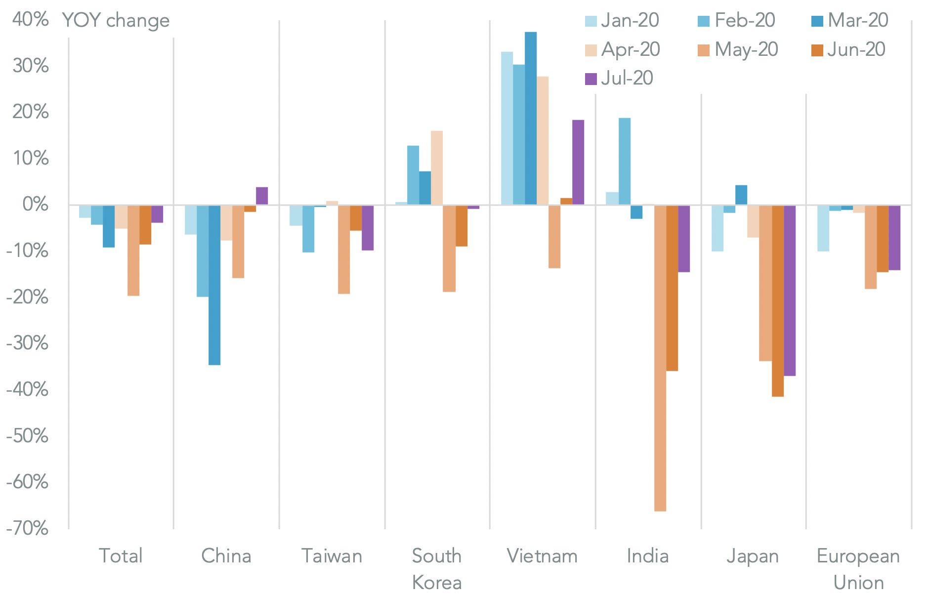 Shipments from the rest of Asia fell by just 3.2% after a 13.8% slide a month earlier thanks to improvements in trade with Singapore and Vietnam while conditions also improved in trade with South Korea and India. The fly in the ointment was trade with the EU which has continued to decline at a 14.0% rate after a 14.4% dip in June.