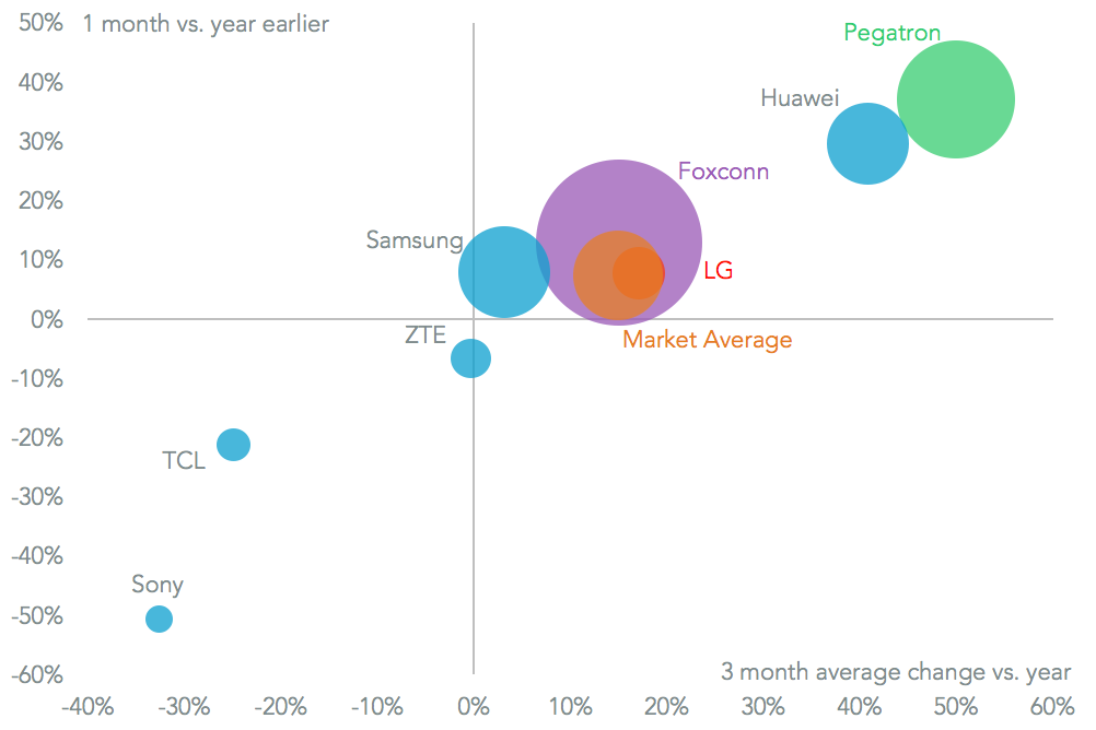 Among the largest manufacturers Pegatron led, with a 49.9% rise in exports in the past quarter on a year earlier. Number one exporter, Foxconn, saw increases rise 15.0% to take a 29.9% share of all shipments. Smaller brands including TCL and ZTE actually took a step back.