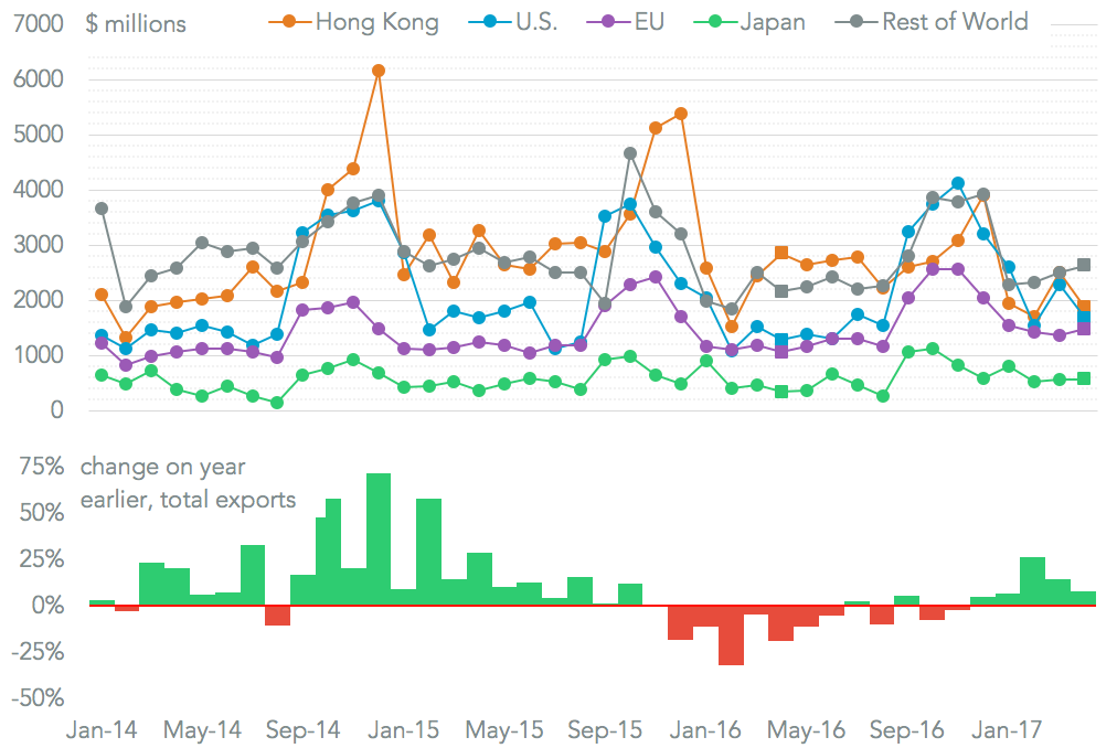 Chinese mobile phone manufacturers have had a strong start to the year, with exports for the three months to April 30 rising 14.9% on a year earlier, Panjiva data shows. That has been led by a 41.8% rise in shipments to the US. Shipments via Hong Kong actually fell 10.9%, possibly reflecting supply chain shifts as well as weaker demand in other Asian markets.