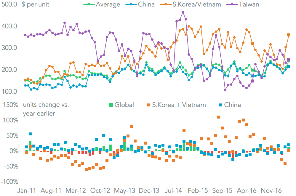 At the same time, average handset values climbed 14.1% in April on a year earlier. That was led by a 65.2% rise in the value of each handset shipped from Taiwan to reach $245. The most likely cause is the production of the Google Pixel phone, produced in Taiwan by HTC.