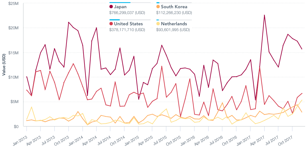 The find in Japan will take years, rather than months, to develop but given buyers in Japan are by far the largest importers from China, with demand having increased by 48.4% to reach $180 million in 2017, there will be a clear commercial impetus to extract the new reserves swiftly. China’s exporters, led by Grierem Advanced Materials, may need to divert supplies to other countries.