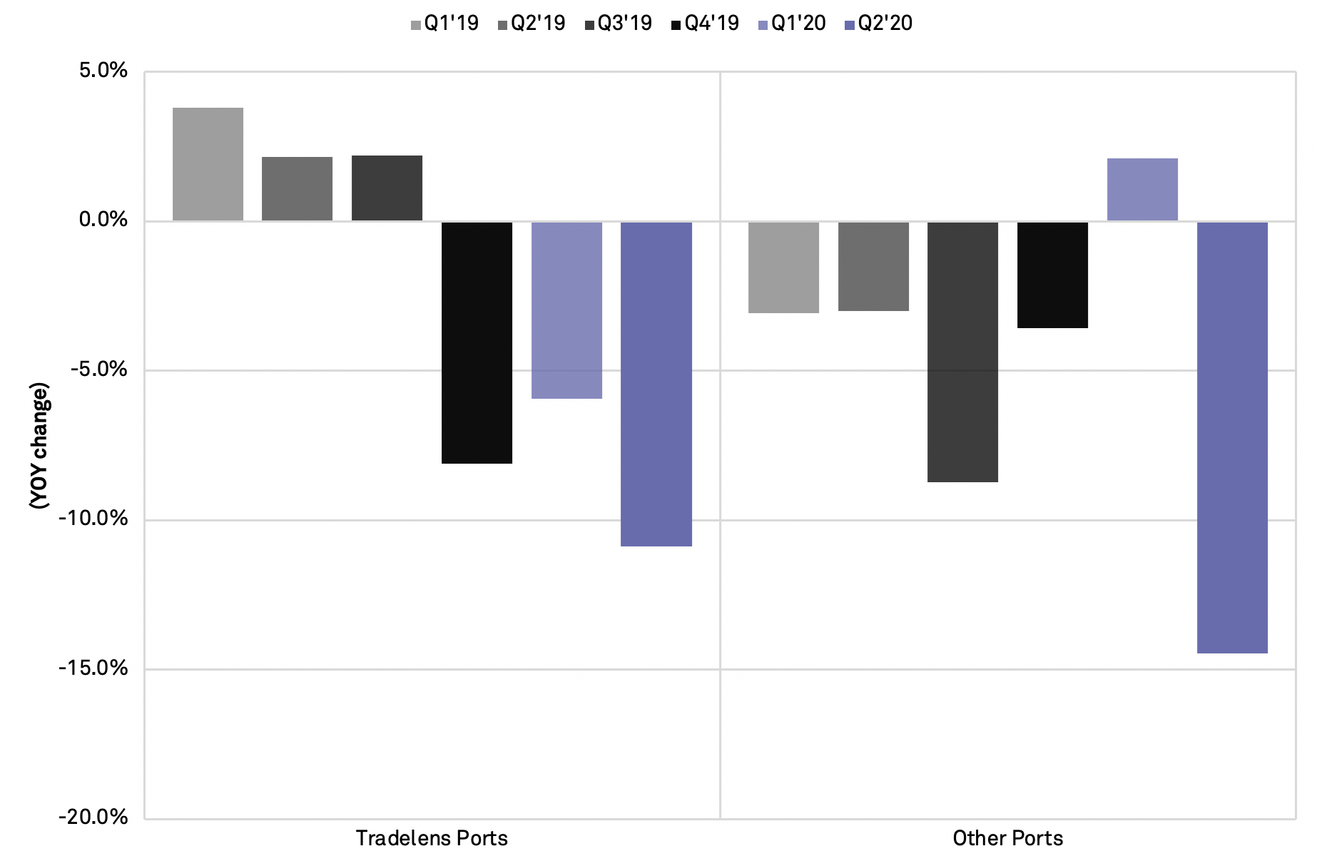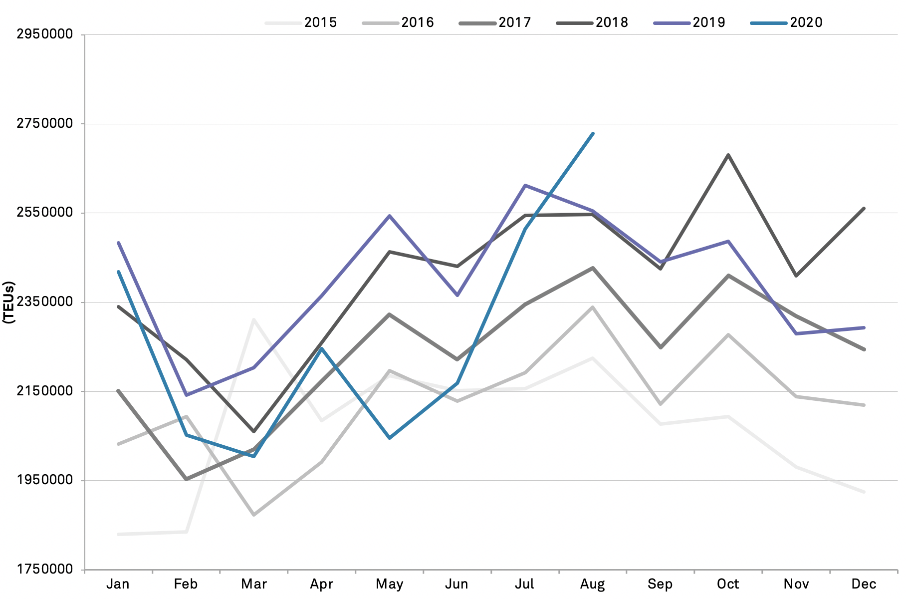 The uneven reopening of industrial facilities globally has led to continued supply chain difficulties in the third phase. One example is the stricter closure of non-essential manufacturing in Mexico and India compared to customer markets such as the US, which has led to plants opening and then having to suspend production. That process has largely been unwound; US seaborne imports in the first half of August have increased by 6.8% year-over-year, including a surge in shipping from China and a return to growth in imports from the EU. A surge in freight rates, particularly on transpacific routes, shows that the prior reductions in capacity have only slowly been reversed while a variety of surcharges are being used in an attempt to rebalance route demand to better match equipment availability.