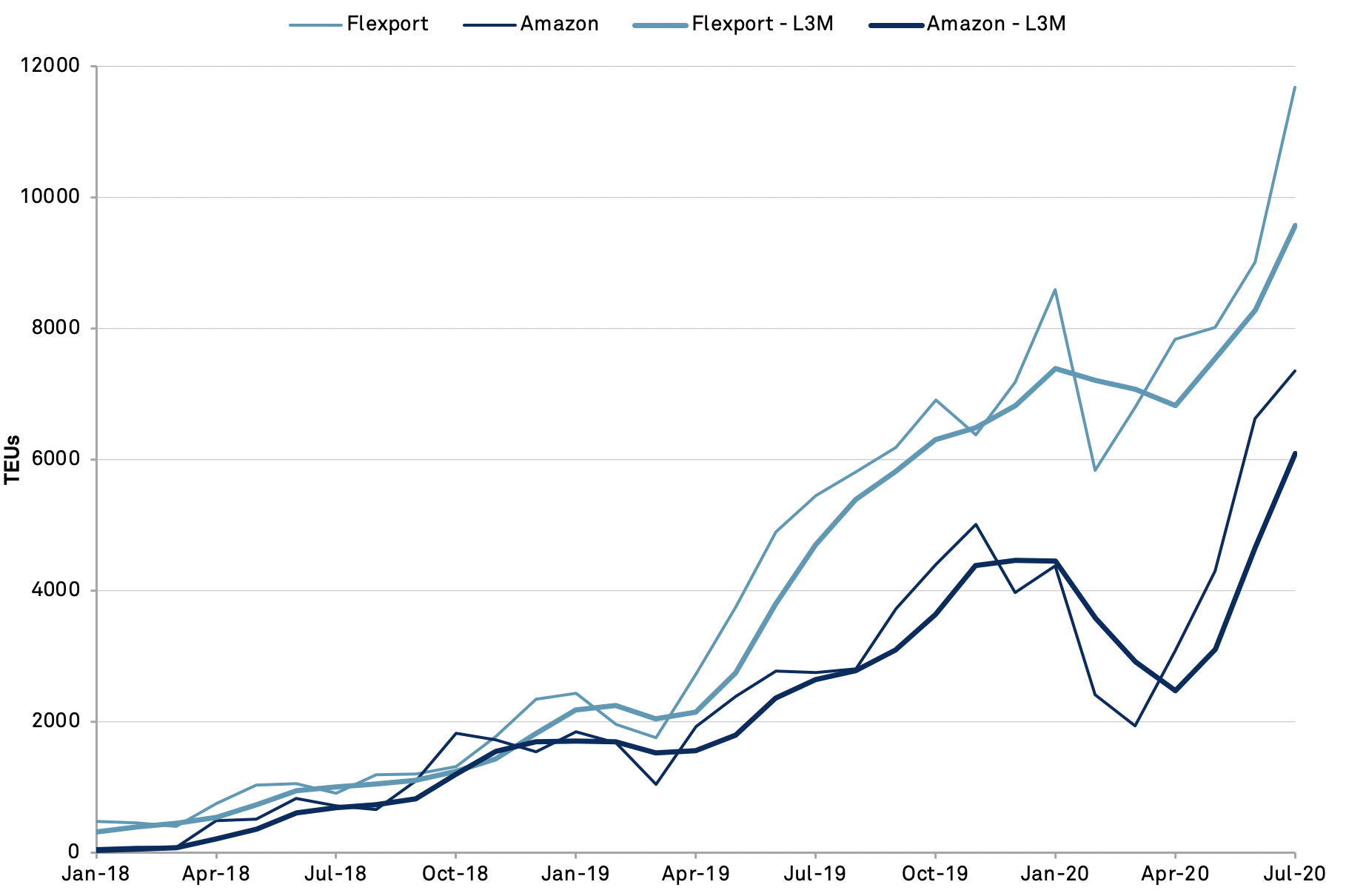In the digital freight forwarding space, Flexport, Forto and iContainers have all made market share inroads, while Amazon has set up a dedicated forwarder to provide services to its Chinese exporting customers. Panjiva’s datashows that Flexport and Amazon have reached 26.0% and 16.6%, respectively, of the size of the average of the top five forwarders on US-inbound, seaborne shipping lanes in the three months to July 31 from 2.6% and 2.0%, respectively, in 2018. Both have also continued to grow during the COVID-19 pandemic.