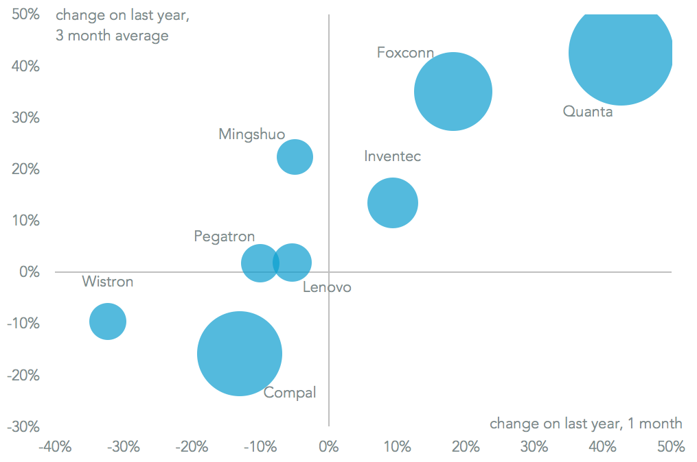 Lenovo also lagged it’s China-based peers, with global exports having fallen by 5.4% on a year earlier in August. It did better than Pegatron, which dropped 10% and lagged Hon Hai’s 18.1% growth – reversing the situation seen in smartphones, as outlined in Panjiva research of October 11. Quanta meanwhile saw the fastest growth with a 42.6% expansion making it the largest exporter of computers from China.