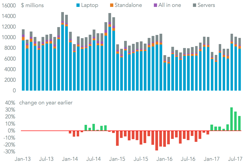 Looking globally there is a risk of oversupply. Exports from China increased 21.2% in August vs. a year earlier across all categories in dollar terms. That brought the total for the three months to August 31 (effectively products sold or inventoried for the third quarter) to 27.2% above the year earlier level. Tower-type machines grew the quickest in August with a 39.6% growth, while all-in-one PCs grew by just 3.9%.