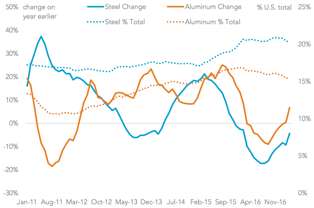 One area where Chinese officials could help the broader objectives of the U.S. administration is in metals. President Donald Trump has issued Presidential Memoranda calling for accelerated investigations into the steel and aluminum sectors. U.S. imports of both products increased in the first quarter. Panjiva data shows steel imports from all countries increased 16.2%. While China lagged with a 3.9% increase it still accounts for 20.3% of U.S. imports on a trailing 12 month basis, up from 16.3% in 2012.