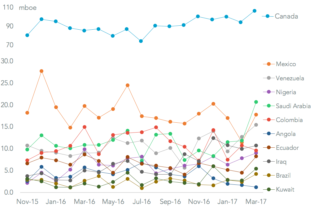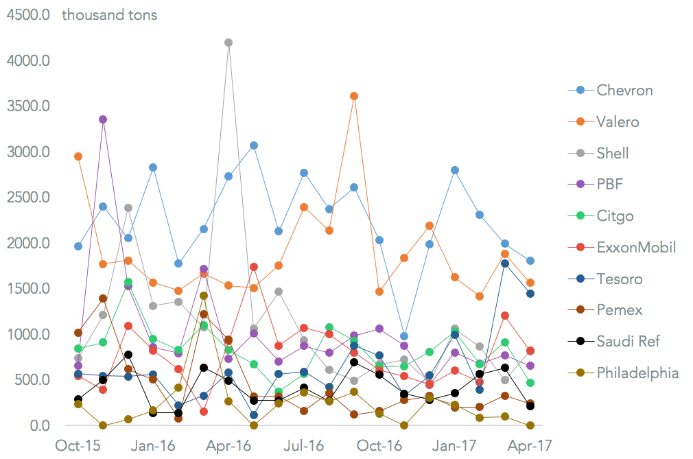 Import growth in April was more likely dominated by Canada and Mexico, however, with refiners importing by sea cutting shipments by 39.2%. Royal Dutch Shell made the largest cut in absolute terms, with an 80.6% cut compared to an abnormally high level of imports a year earlier. The increase in imports from Saudi Arabia in March was not repeated in April. That was likely ahead of the restructuring of Motiva, the refining joint venture between Shell and Saudi Aramco that has now been unwound. The only significant growth came from Tesoro on the back of its acquisition of Western Refining.