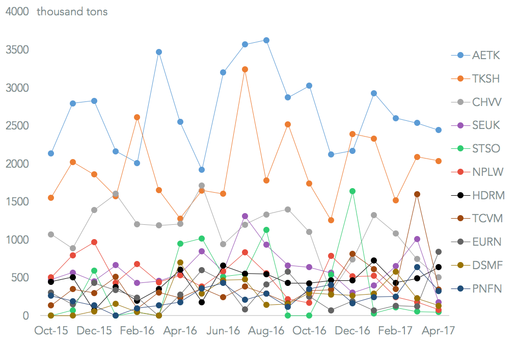 Perhaps unsurprisingly among the main carriers Shell’s in-house operation saw the fastest decline, with a 68% drop in shipments on a year earlier. Tsakos also saw a major downturn in handling following a jump in revenues in the first quarter when new vessels were delivered. By contrast Euronav saw a 206% rebound, which brought it to third largest carrier from 19th a month earlier. That may be a reaction to having had a disappointing third quarter.