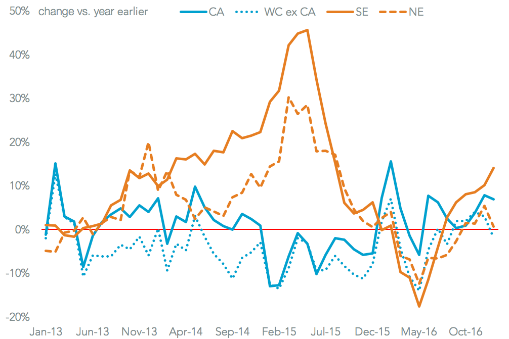 The Georgia Ports Authority and the Port of Virginia have filed a cooperation agreement with the Federal Maritime Commission. While a long way from a formal merger, this will allow closer operations from a strategic perspective. Structurally the east coast has been gaining market share over the west coast as a result of the Panama Canal extension, as discussed in Panjiva research of February 13.