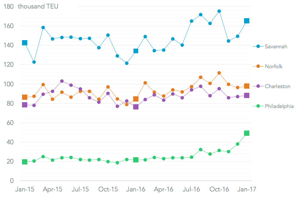 The move may allow both to gain an edge over fast-growing local competition. In the case of Savannah this is Charleston, which had its month ever in January when combining export and import traffic, though Savannah was no slouch and expanded 16%. For Norfolk VA the main threat is Philadelphia. While Philadelphia was only 29.6% the size of Norfolk, Panjiva data for import volumes over the past 12 months shows, it has nearly doubled on a year earlier. That has been driven by new routes, according to local press reports.