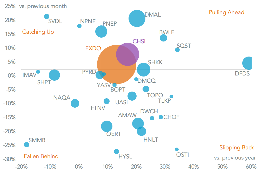 The Non Vessel Operating Common Carriers (NVOCCs) operating on U.S.-inbound lines saw a strong performance in March, with total U.S.-bound volumes rising 7.3% on a year earlier. That was the result of increased shipments from Asia, as outlined in Panjiva research of April 6. The top 10 by scale outperformed significantly, Panjiva data with a combined 12.8% growth on a year earlier. The fastest growth was experienced by DSV, which expanded 59.2% as a result of the acquisition of UTi that was completed in August. Adjusting for that its growth was a more modest 1.9%. Panalpina underperformed, with growth of “just” 7.8% while Shipco dropped for a second month by 8.6%.