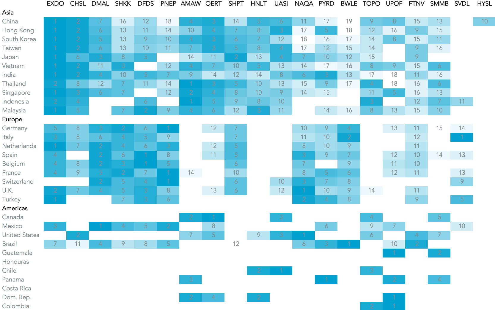 Panjiva analysis of 3,400 NVOCC-country pairs shows Expeditors, CH Robinson, Orient Express and Apex dominate on Asia-U.S. routes while Deutsche Post-DHL, DB-Schenker, DSV and Panalpina lead on Europe routes. There are few significant operators on intra-Americas routes among the top 20 NVOCCs. That pattern marks a contrast to the globalized nature of the carrier alliances, and may limit the effectiveness of the NVOCCs to customers that are looking for broader based solutions.