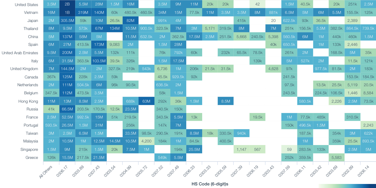 The U.S. is India’s most significant export market for fish, Panjiva data shows, with $2.2 billion of shipments (or 30.6% of the total) in the 12 months to June 30. Diversions to China may require a significant sales effort given exports were just $250 million over the same period. Shipments of shrimp, the largest product at 70.0% of the total with America accounting for 42.0% of the total, or $2.1 billion. China’s imports of shrimp were $137 million.