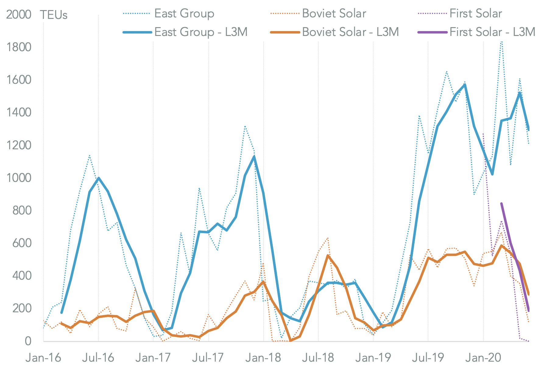 The share of U.S. seaborne imports from South Korea rose from 43.1% in 2016 to 89.5% in 2018 before declining to 67.9% in H1’20. That came at the expense of Hanwha’s Malaysian facilities which fell to 10.4% of U.S. shipments in 2018 from 44.5% before recovering to 25.1%. Imports from China linked to the firm have been sporadic and minimal, perhaps unsurprisingly given the shifting tariff landscape over the past five years.