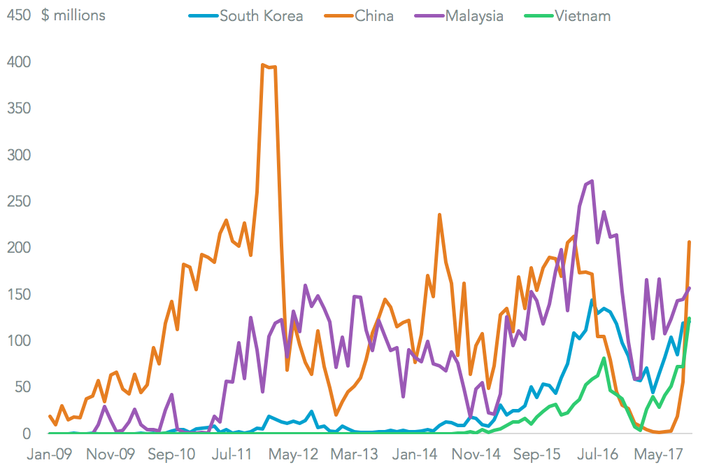 The interest of the Korean government is not surprising. South Korea accounted for 22.4% of U.S. solar power equipment imports in the 12 months to October 31, Panjiva data shows. It had been one of the countries that had picked up market share from China after the latter was hit with tariffs. Its notable though that imports from China hit their highest since March 2016 in October ahead of initial decisions were made in the case, as outlined in Panjiva research of November 1.