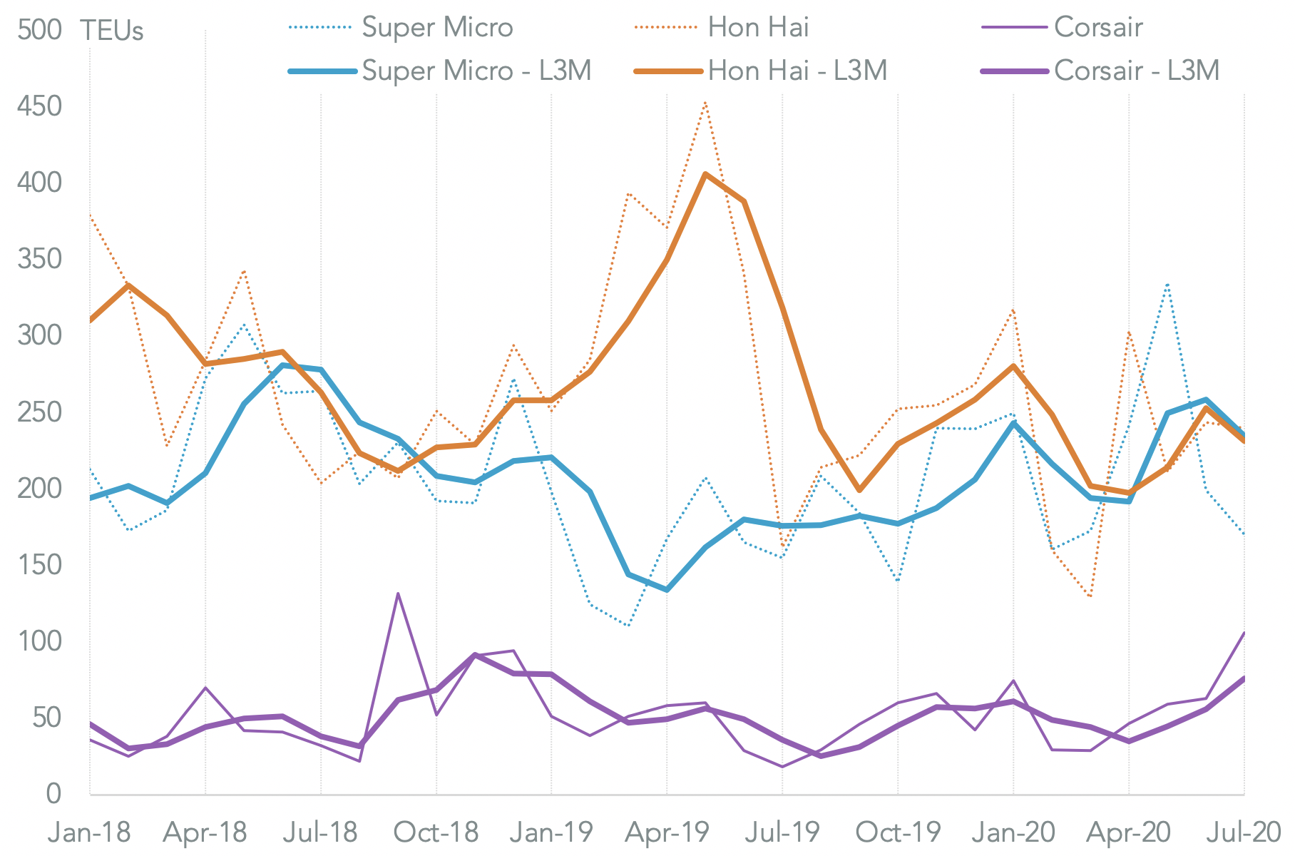 Super Micro’s imports are led by computer components (HS 8473) where total U.S. seaborne imports have also accelerated as demand for work-from-home systems has increased during the COVID-19 pandemic. Indeed, Panjiva’s data shows that imports in July climbed 25.4% year over year after rising by 6.5% in Q2.