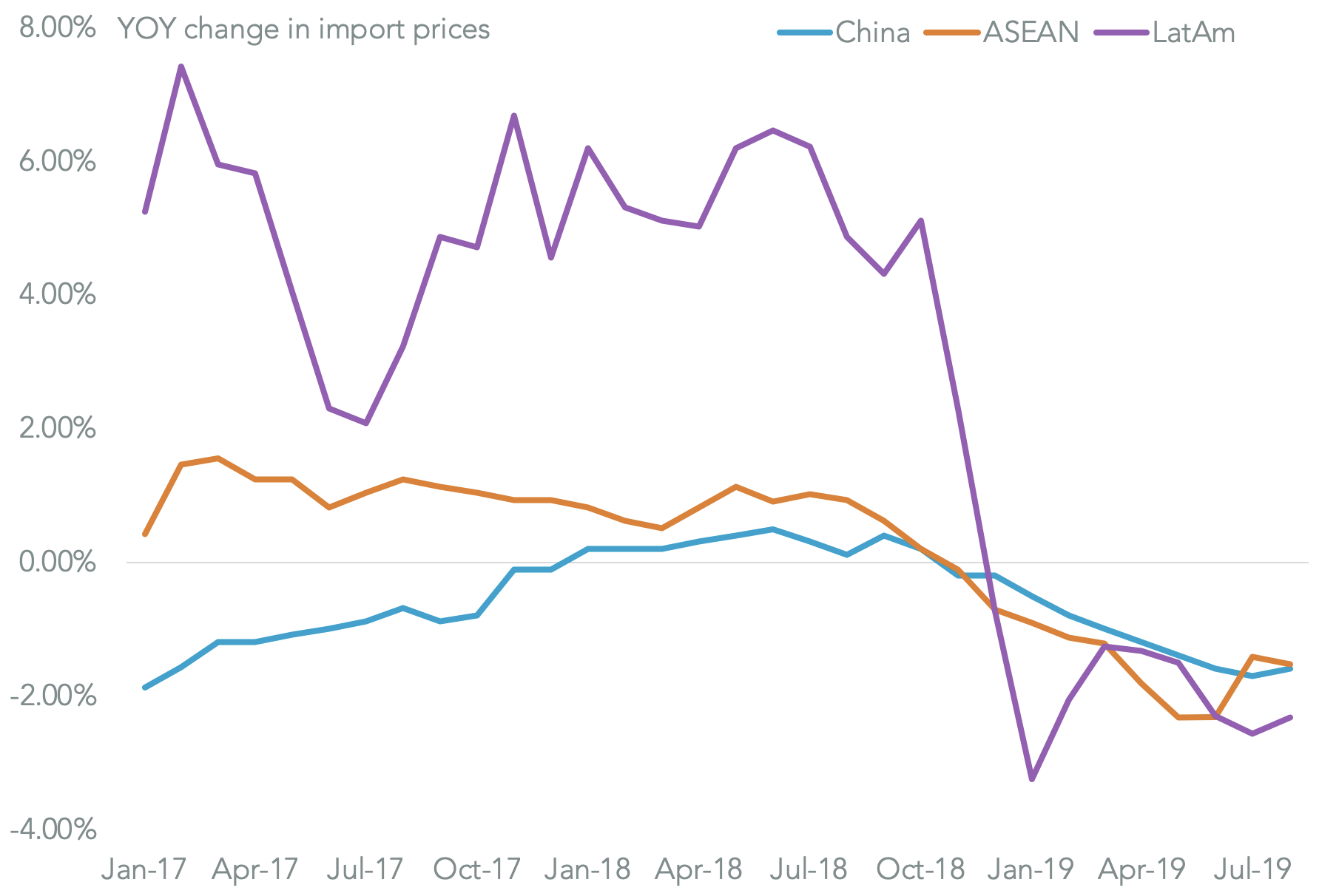 The slowing rate of deflation was widespread with the fastest rate of declining prices being seen in Latin America where there was a 2.3% drop, followed by China with a 1.6% slide. The latter was the 10th straight downturn and has largely been driven rising U.S. tariffs on Chinee exports as outlined in Panjiva’s research of Sept. 5. Tariffs are only part of the story with prices from the ASEAN region down 1.5%.