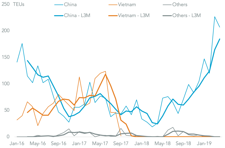 Foxconn’s U.S. seaborne imports of telecoms equipment, mostly routers, have refocused entirely on China in the past year having previously included Vietnam.