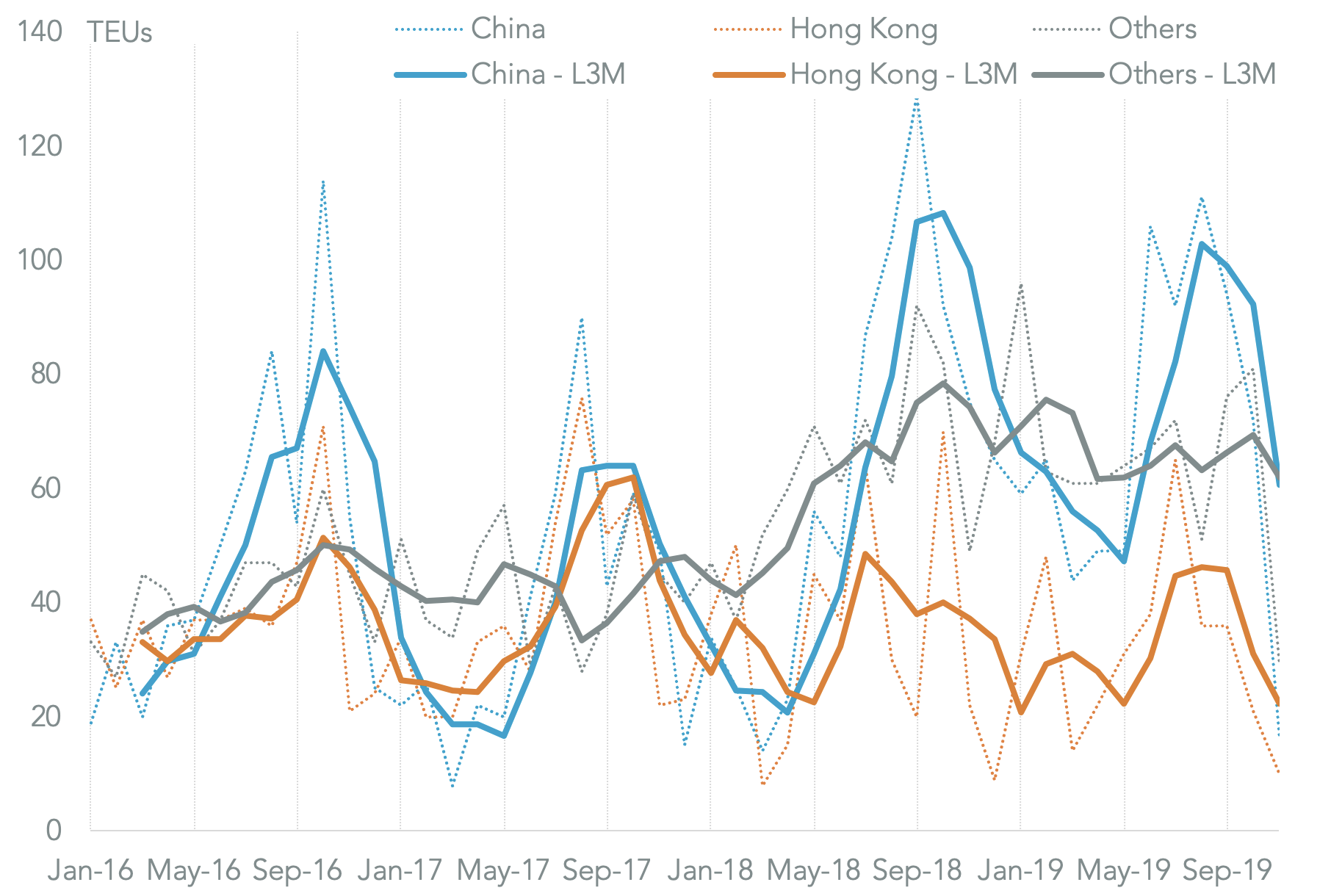 U.S. seaborne imports linked to Guess? from mainland China already declined to 41.8% of the total in the three months to Nov. 30 from 46.9% a year earlier. That represents a 38.5% slide in absolute terms, though there is evidence of stockpiling in August ahead of the list 4A tariff introduction in September. The inventories associated with that stockpiling were likely worked down in the past three months.