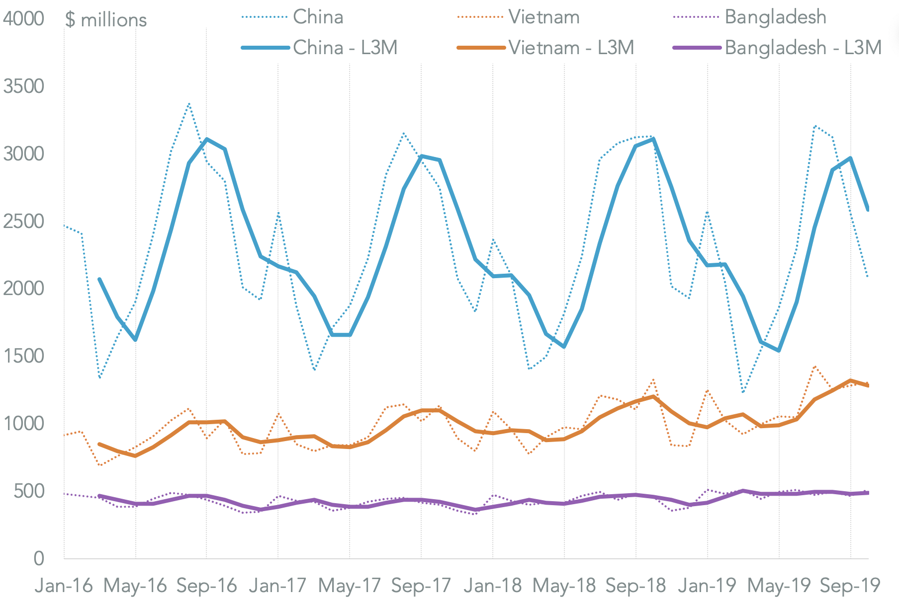 Panjiva data shows total U.S. imports of apparel from China dropped by 16.9% year over year in the three months to Oct. 31. That’s been partly replaced by imports from Vietnam which increased by 6.4% while those from Bangladesh increased by 6.6%. Yet, there may be an overall weakening of demand – total imports fell by 4.4% – while China still represents 32.6% of all imports of apparel.