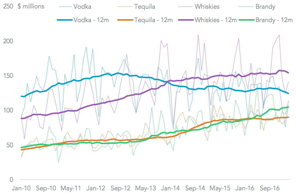 That was mostly at the expense of vodkas, which dropped to a 20.9% market share from 31.0%, which also lost out to brandies and whiskies over the same period. Among the major shippers to the U.S. that likely means that Absolut has lost out the most due to its focus on vodka. It may also suffer short-term due to disruptions to shipping out of Sweden. Among brandy shippers, Remy Cointreau is the leader.