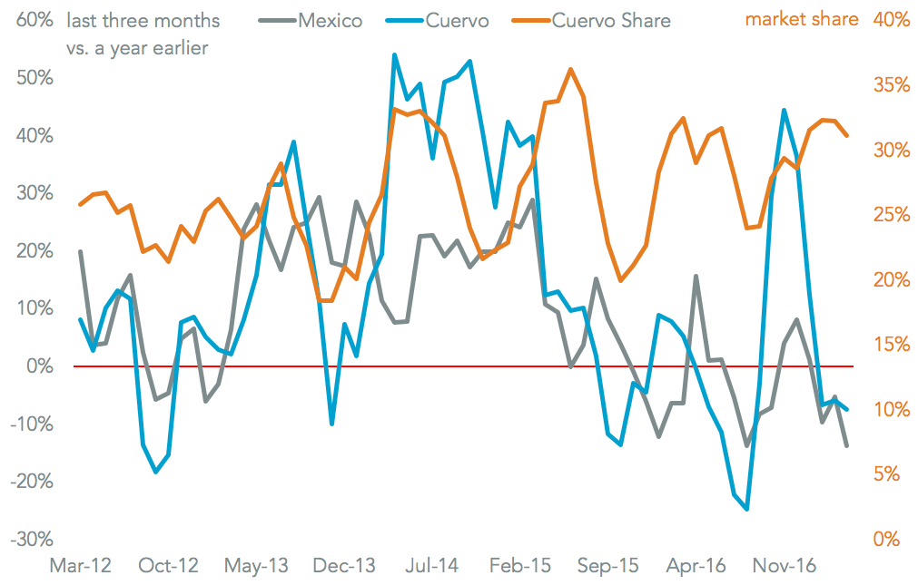 While there may have been a rush to ship tequila to the U.S. the global fortunes of Mexican tequila shippers is not as strong. Exports in the three months to April 30 were 13.8% lower than a year earlier, the fastest rate of decline since at least 2012. Number one shipper Jose Cuervo has not seen as fast a slowdown, dropping 7.5%, despite an acceleration in exports ahead of its initial public offering.