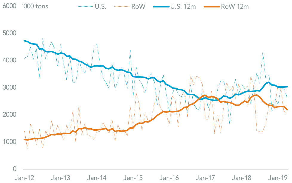 Panjiva data shows Mexico exports 58.1% of its crude oil to the U.S. in the 12 months to Apr. 30. It has also become increasingly reliant on the U.S. with shipments to the U.S. having climbed 1.8% year over year in the three months to Apr. 30 while exports to the rest of the world fell 15.6%.