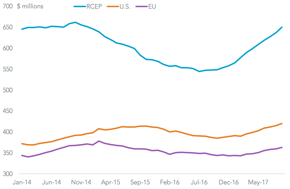 The reliance on the U.S. and EU as trade partners has, in part, led the Chinese government to put together a regional trade group as a counterbalance. As outlined in Panjiva research of November 10 that has led to calls, led by President Xi Jinping, to push towards multilateral deals in the Asia region.