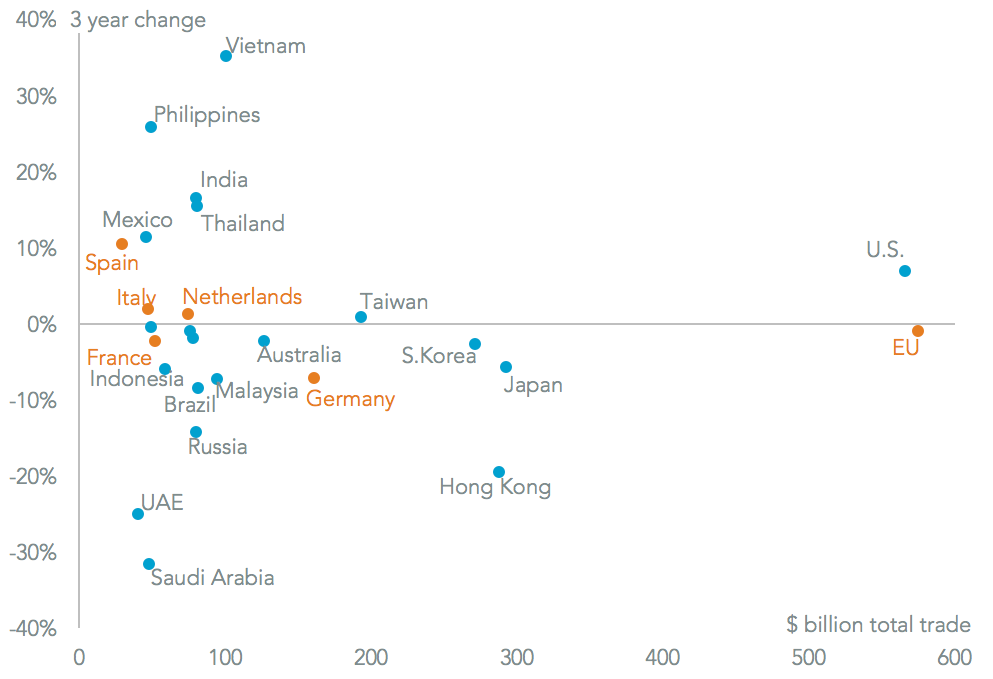 A segmentation of trade by destination country and country of origin shows the slowdown in trade partly reflects an earlier decline in raw materials costs, as can be seen by the drop in trade activity with OPEC members including Saudi Arabia (down 31.5% in the past 12 months vs. the same period three years earlier) and the UAE (25.0% lower). It also reflects a shift in manufacturing centers for major Chinese companies with a shift to lower cost production centers.