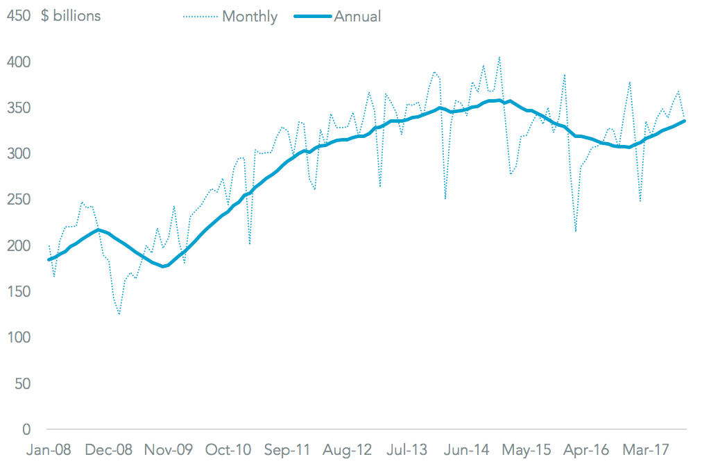 Panjiva data shows total trade (measured by the some of goods exports and imports) reached $4.03 trillion in the 12 months to October 31. While that was 7.7% better than a year earlier growth over the past five years has average just 0.6% annually, and is still 6.4% below its 2014 peak. The recovery has been driven by imports, which rose 16.3% in the past quarter on a year earlier, while exports expanded by just 6.7%.