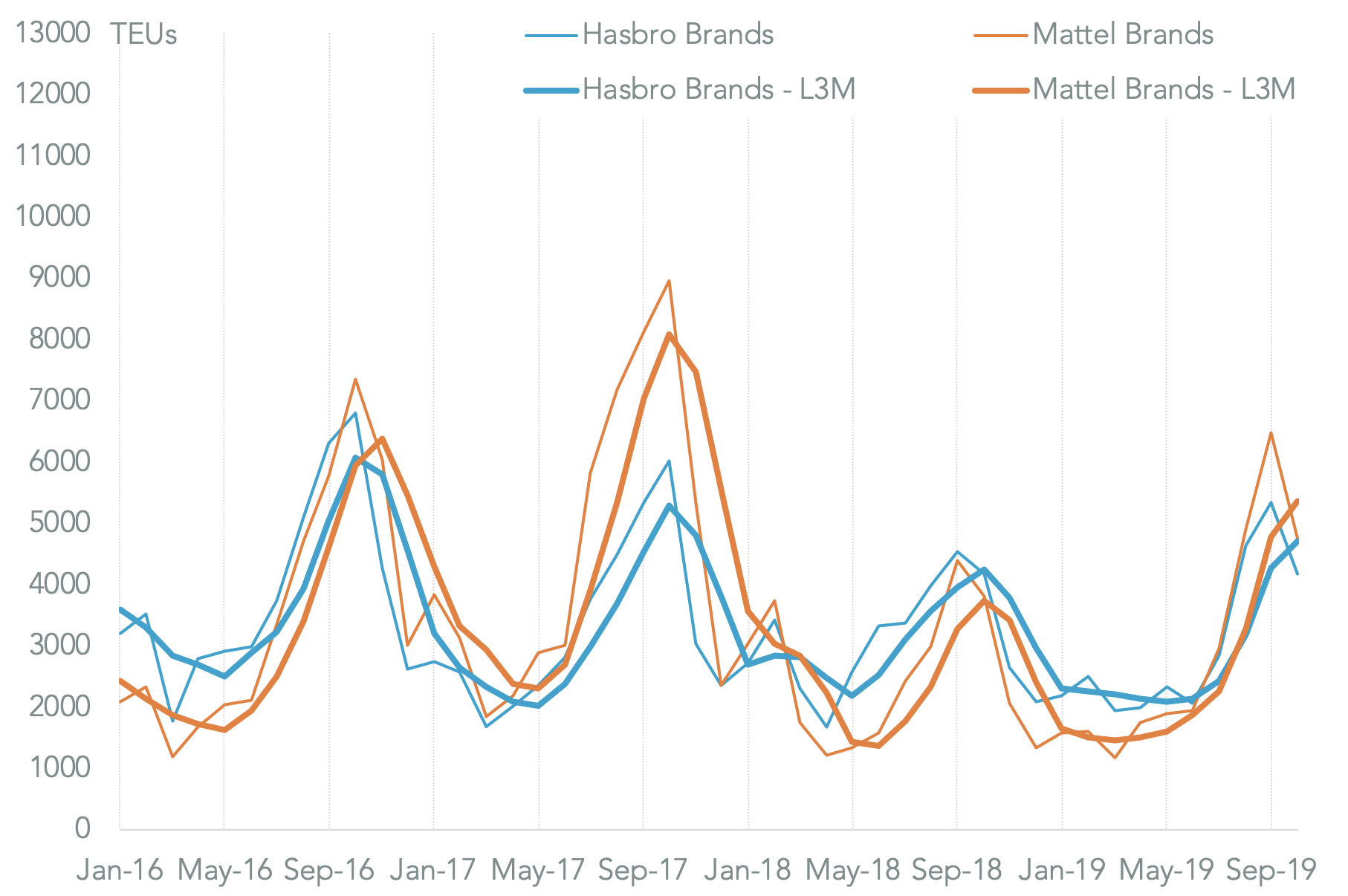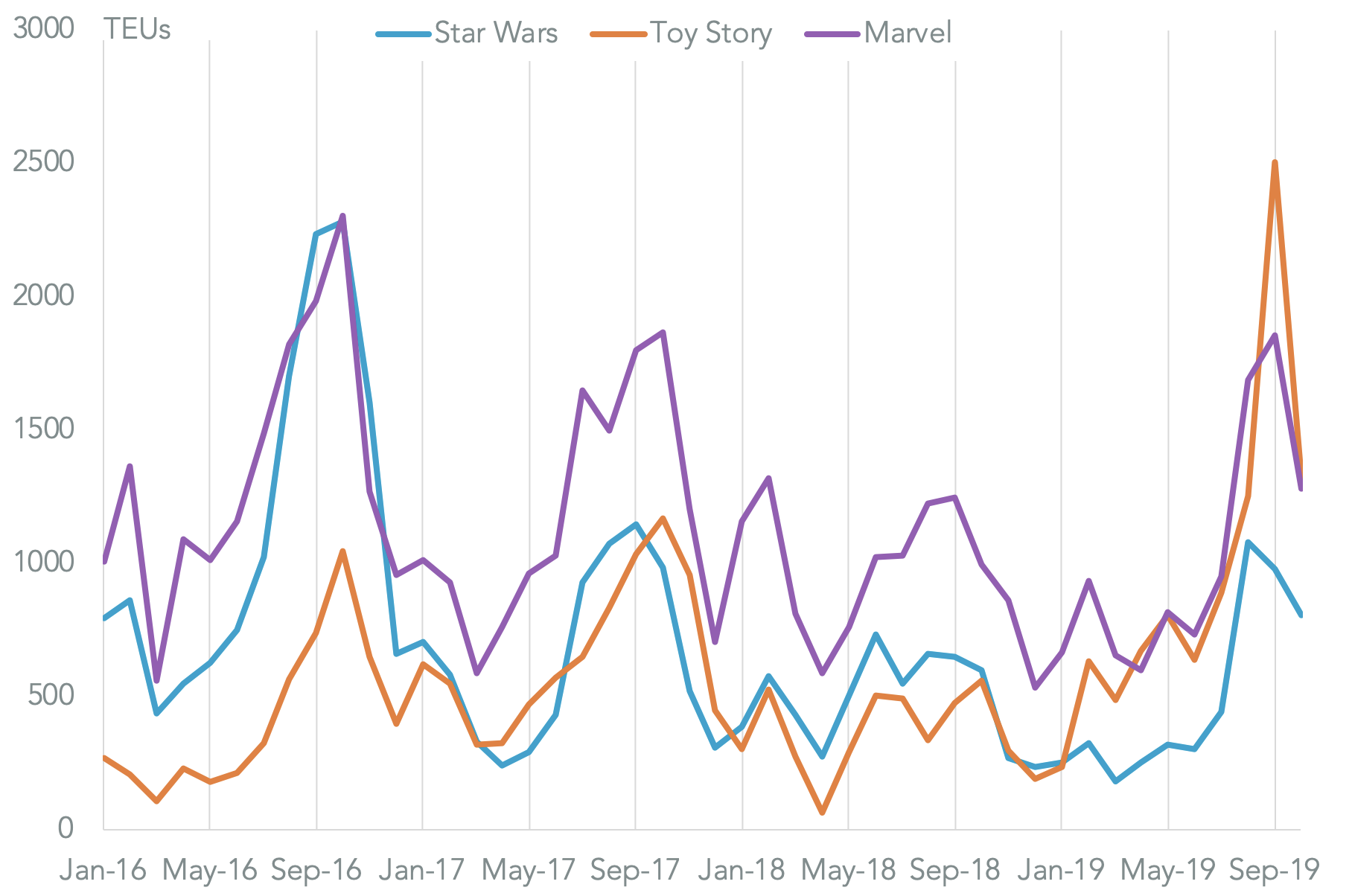Among the major brands, the strongest performance has been among movie tie-ins. Toy Story related imports surged 135% higher year over year in October after a 254% jump in 3Q that may be linked to the final movie of the series.