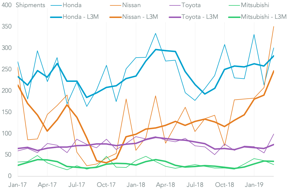 Panjiva data shows that Toyota’s likely started to reprioritize the U.S. with seaborne shipments having risen by 6.5% year over year in March after a 24.0% drop in the prior three months. The fastest expansion among the majors has been Nissan with an 85.7% surge in March. Honda and Mitsubishi have both cutting U.S. shipments with a 10.1% and 20.0% reduction respectively.
