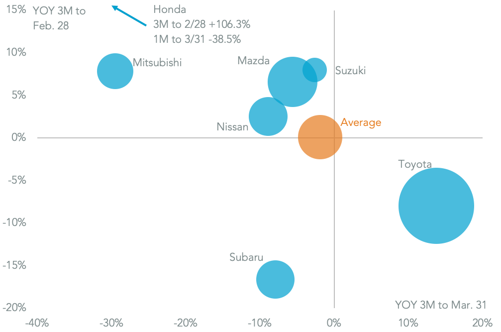The worst performers in March were Honda – whose exports fell 38.5% for the month after an earlier surge – and Mitsubishi with a 29.5% slump. Indeed, only Toyota saw an expansion in exports in March with an increase of 13.8% reversing an earlier decline.