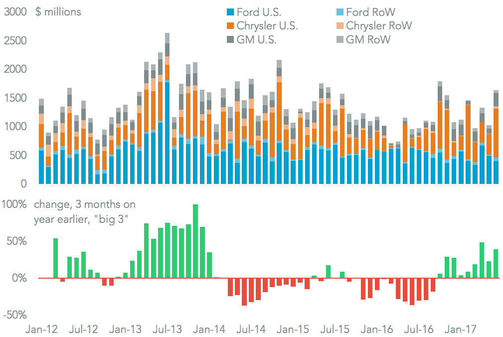 General Motors’ focus on light trucks is making it more reliant on the U.S. as an export market for its Mexican production. In the second quarter 69.8% of its exports were U.S.-bound, compared to 45.7% on a year earlier, Panjiva data shows. By contrast Ford has seen the ratio drop to 91.6% from 96.3%, possibly because of falling demand for its car-oriented portfolio in the U.S., including the Fiesta compact.