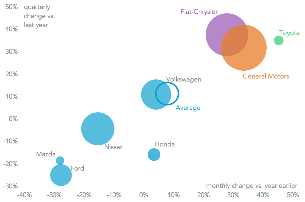 Growth was led by Fiat-Chrysler and General Motors which expanded 27.8% and 33.4% respectively. While July is traditionally one of the quieter months for production in the year that would suggest GM’s success with the GMC Sierra light truck (11.3% higher than a year earlier) and Fiat Chrysler’s Journey crossover SUV (42.2%) is proving sustainable. Kia’s growth of 52.4% (not shown in the chart below) is the result of production of the Forte compact which was only ramping up a year ago.